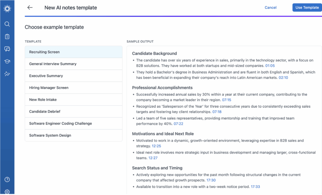 Next-Gen AI Notes Templates help teams capture exactly the information they need from every hiring conversation — without distracting interviewers or having to manually comb through transcripts.