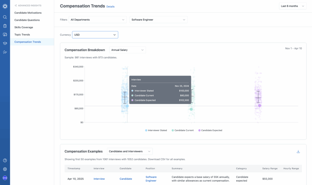 Compensation Trends give hiring teams real, interview-based data to guide compensation decisions. Instead of relying on outdated benchmarks or manual spreadsheets, teams can quickly understand candidate expectations and market movement.