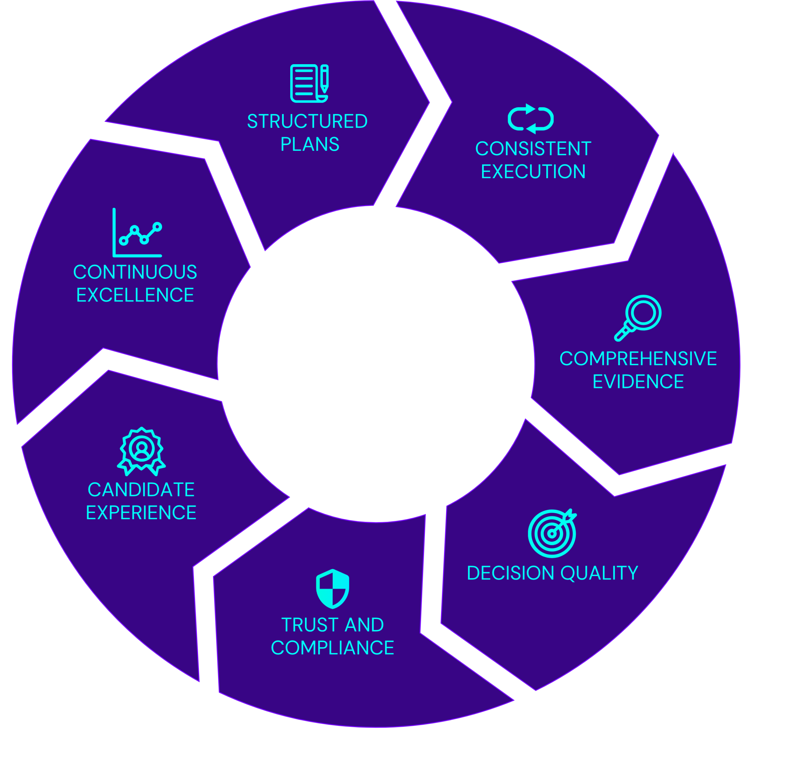 The seven pillars are designed to work together. What you learn from hiring outcomes doesn’t just improve your planning. It sharpens how you calibrate interviewers, what evidence you capture, how you make decisions, and how you evaluate candidate experience. That requires deliberate tracking.